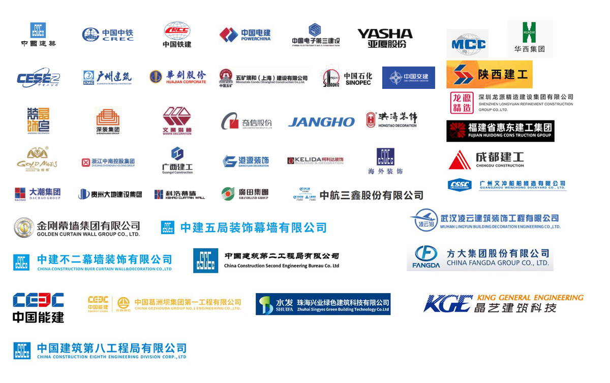 公司參建了諸多大型項(xiàng)目工程,如港珠澳大橋、珠海國(guó)際航展、深圳國(guó)際會(huì)展中心、廣州白云機(jī)場(chǎng)、西安全運(yùn)會(huì)場(chǎng)館、成都東安湖大運(yùn)會(huì)場(chǎng)館、樂山奧體中心、洛陽(yáng)奧體中心、增城富士康廠房、惠州中海油、陽(yáng)江核電站、珠三角各地鐵線、高鐵站、廣西桂林機(jī)場(chǎng)、廣西柳州文化廣場(chǎng)、四川成都天府機(jī)場(chǎng)、海南海口美蘭機(jī)場(chǎng)、西安絲路會(huì)展中心、惠州北站等等。與中國(guó)建筑、中國(guó)中鐵、中國(guó)鐵建、中國(guó)電建、中國(guó)交建、中國(guó)中冶、中國(guó)能建、廣東建筑、廣西建工、廣州建筑等大型國(guó)有企業(yè)下屬公司及江河幕墻、金螳螂裝飾等各大建筑裝飾、幕墻裝飾公司達(dá)成長(zhǎng)期友好合作關(guān)系。